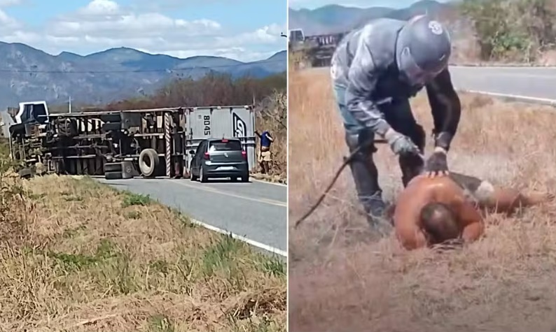 Um ataque de abelhas fez um motorista perder o controle do caminhão, bater em um poste e tombar o veículo no quilômetro 323 da rodovia CE-265, no município de Catunda, no interior do Ceará, na tarde deste domingo (17).