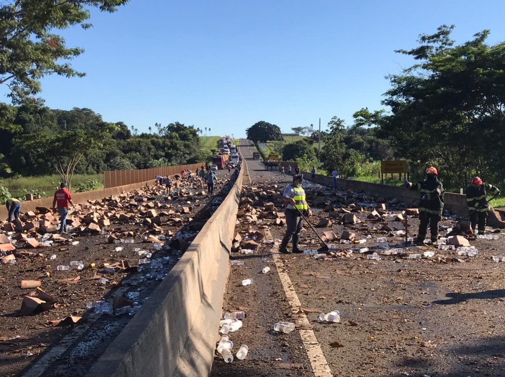 De acordo com as informações da Polícia Rodoviária de Jales (SP), o caminhão estava carregado com pinga e álcool de uso doméstico. Os produtos ficaram espalhados pelas duas faixas da Rodovia Euclides da Cunha. Equipes foram acionadas para realizar a limpeza.