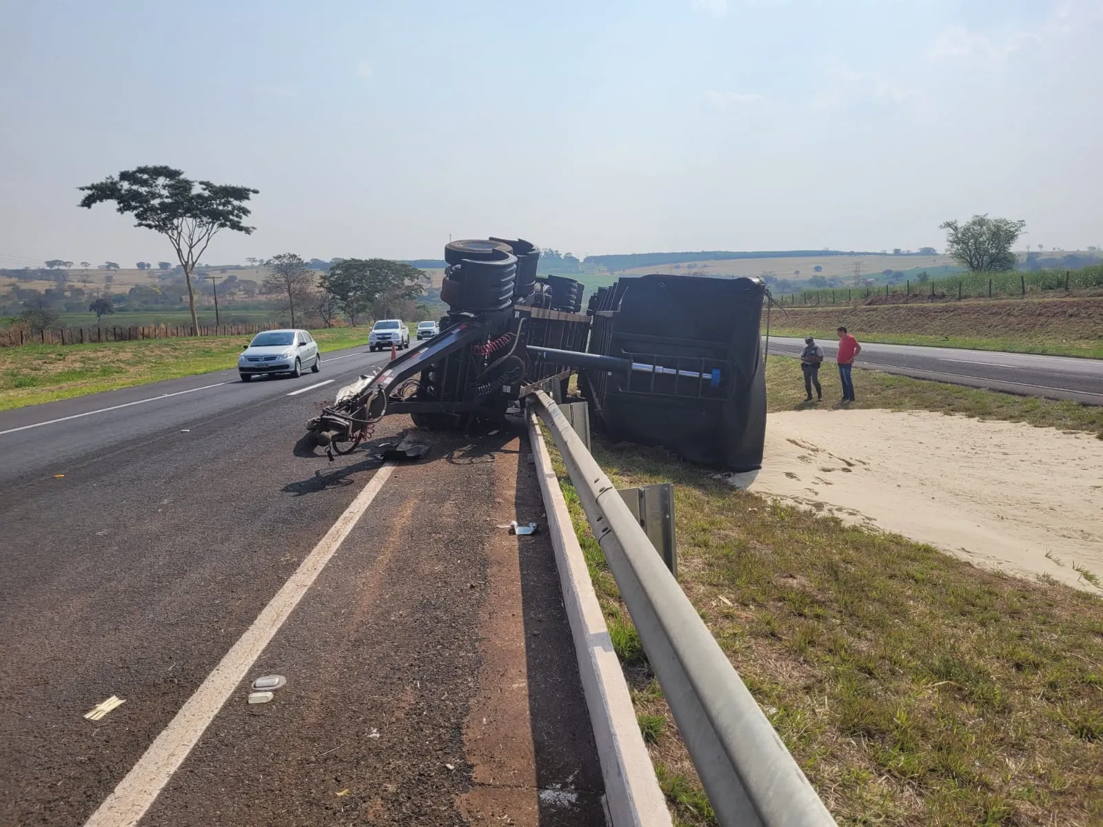 A carreta estava carregada com açúcar e parte da carga ficou espalhada no canteiro. Ainda segundo a polícia, o motorista da carreta não ficou ferido e a pista foi liberada. As causas do acidente devem ser investigadas.