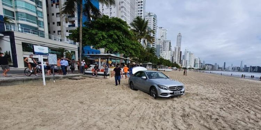 Um motorista foi multado após invadir com um carro de luxo a Praia Central de Balneário Camboriú, no Litoral Norte, e atolar na areia. O caso foi registrado por volta das 7h, no domingo (1°), na altura da Rua 3.000. Foi necessário o uso de uma retroescavadeira para a retirada do veículo.