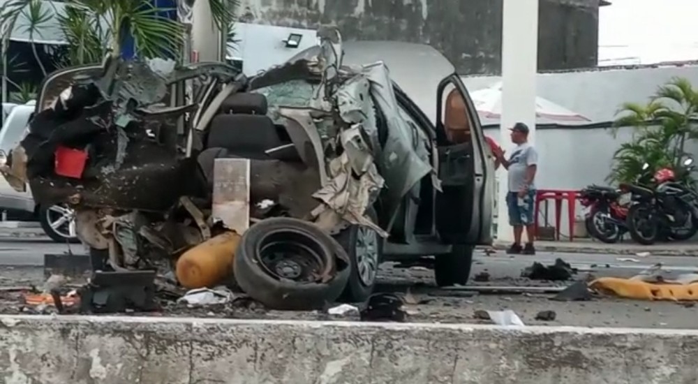 Imagens que circulam nas redes sociais mostram a parte traseira do carro destruída, um cilindro de gás e partes do veículo espalhadas pelo posto.