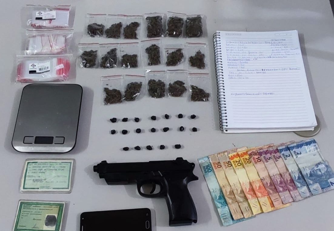 Dentro do imóvel havia outra mulher e, em vistoria, os policiais encontraram mais 17 porções de maconha, 18 pedras de crack, uma balança de precisão, embalagens para drogas, dinheiro, celular e uma arma falsa. Também foi localizado um caderno com anotações que será investigado.