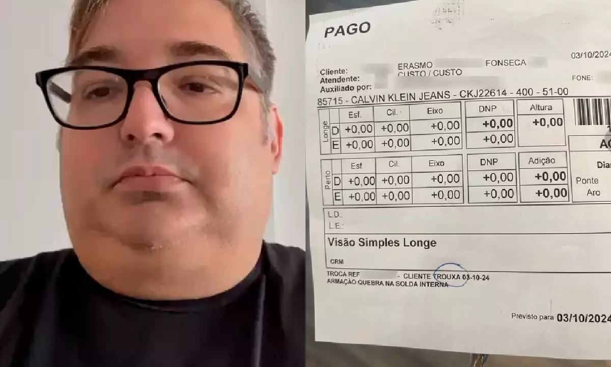 Um advogado de Santos, litoral de São Paulo, se viu em uma situação constrangedora após ser identificado como “cliente trouxa” em um recibo de uma ótica. Erasmo Fonseca, de 47 anos, contou que foi até a Belliótica para trocar os óculos do filho, de 14 anos, em setembro. Porém, o problema se agravou quando a armação quebrou dias depois, e ele retornou ao estabelecimento para solicitar o reparo.
