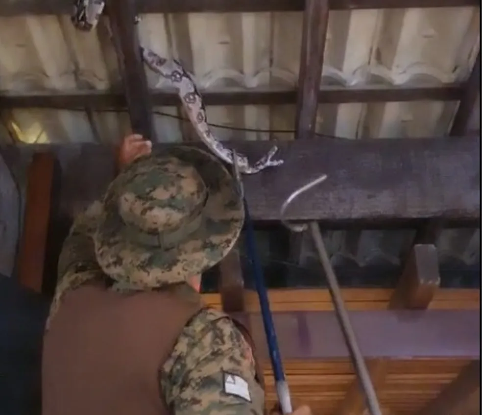 Um policial militar quase foi picado por uma jiboia ao tentar resgatar o animal do telhado de um restaurante no bairro de Stella Maris, em Salvador, na noite de quarta-feira (11). O PM não chegou a ser ferido na ação.