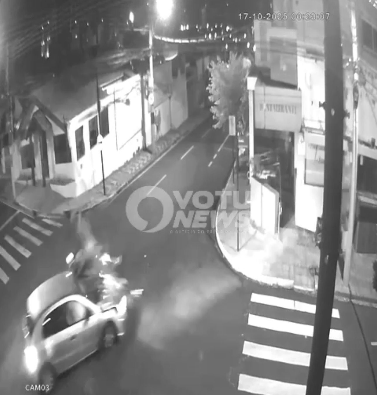 Imagens de câmeras de segurança flagraram o momento exato da forte batida, que ocorreu quando o carro seguia com o sinal verde e foi atingido pela motocicleta. Com o impacto, o veículo teve perda total e os airbags foram acionados.