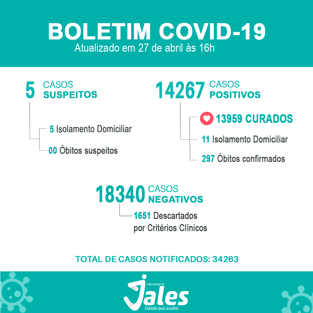 Informamos que mais 3 pacientes foram considerados curados da covid-19 e liberados do isolamento domiciliar. Atualmente Jales contabiliza 13959 pacientes curados.