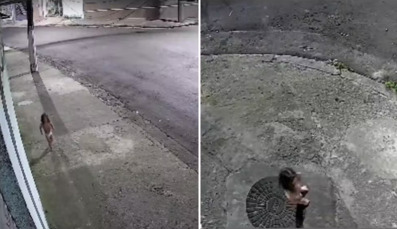 Câmeras de segurança registraram o momento em que a menina caminha sozinha descalça pela Rua Peró Vaz vestindo apenas uma fralda. Nas imagens, a menina aparece chorando e chamando pela mãe, uma estudante de 19 anos.