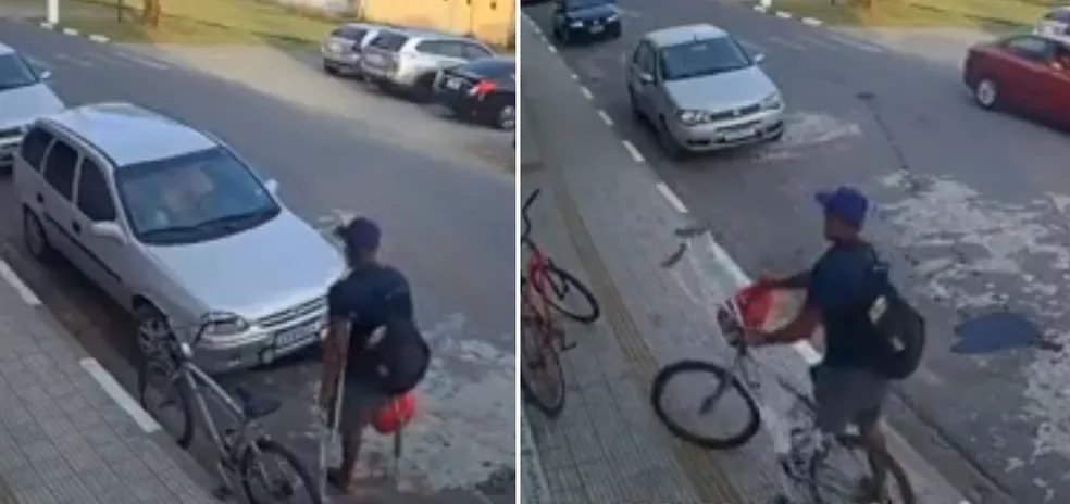 Um câmera de monitoramento instalada em frente ao mercado flagrou toda a ação do criminoso – o furto levou menos de um minuto. Apoiado em muletas e com uma mochila nas costas, o suspeito olha para os lados e fica rondando a bicicleta. Ao perceber que ninguém estava olhando, ele sobe nela e foge.