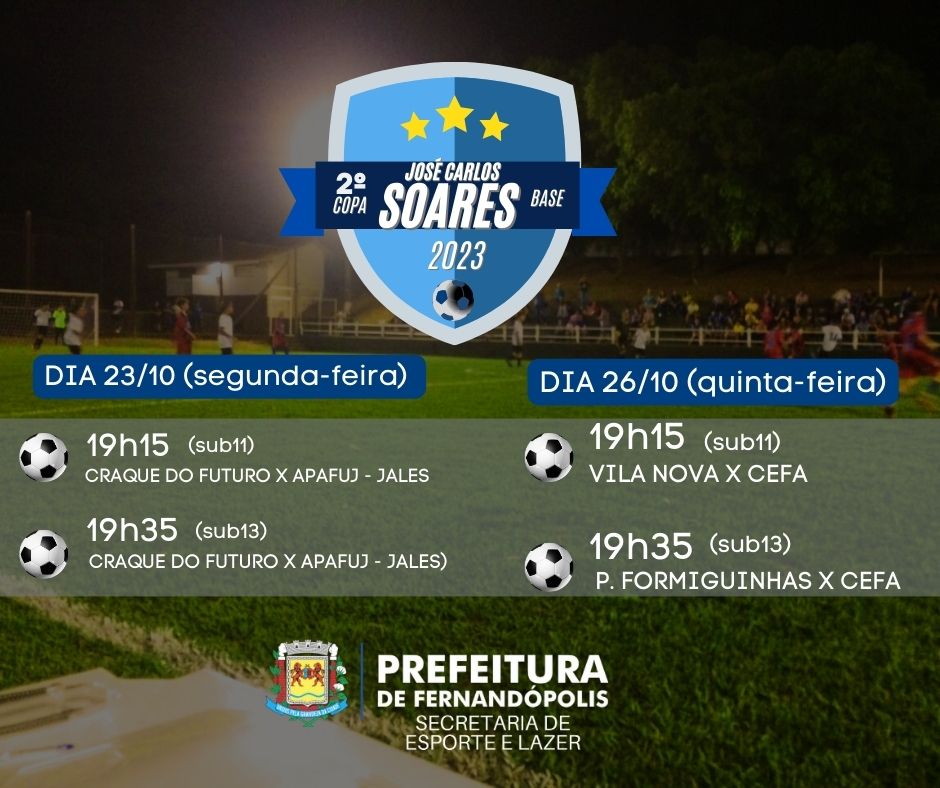 Com um ótimo público em todos os jogos, a 2ª edição da Copa Soares de futebol de base definiu os semifinalistas nas categorias sub11 e sub13. As partidas serão realizadas nos próximos dias 23 e 26 de outubro no minicampo da Secretaria Municipal de Esportes e Lazer.