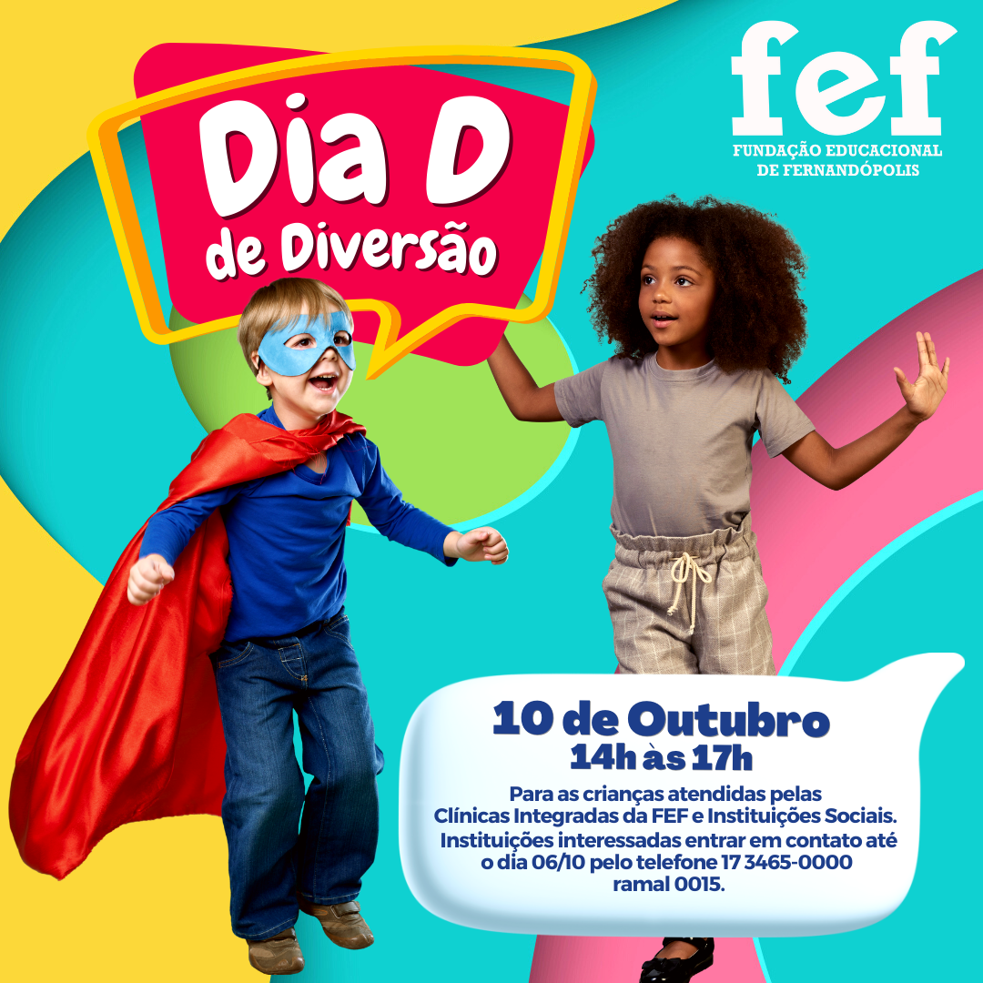 Para deixar as comemorações do Dia das Crianças, celebrado em 12 de outubro, ainda mais doces e divertidas, a Fundação Educacional de Fernandópolis e as Clínicas Integradas da FEF estão preparando uma grande festa, no dia 10 de outubro, das 14h às 17h.
