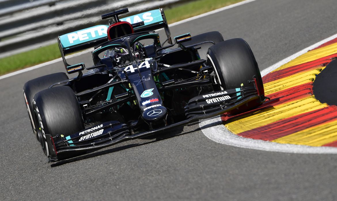 Lewis Hamilton comemorou neste sábado (17) sua 99ª poleposition na Fórmula 1 depois de ser mais rápido que Sergio Perez e Max Verstappen, ambos da Red Bull, no treino qualificatório para o Grande Prêmio da Emilia Romagna, em Ímola.