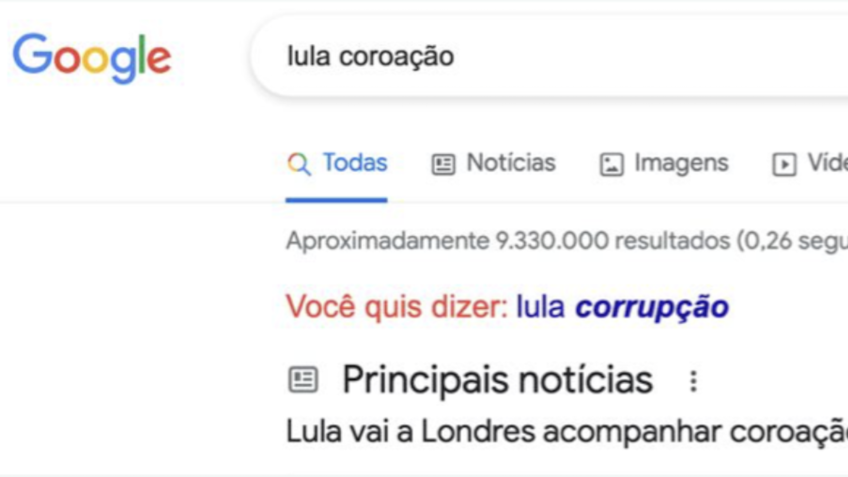 O Poder360 testou e confirmou a informação divulgada pelo influencer. Ao buscar o nome do petista junto da palavra coroação, o buscador do Google recomenda: “você quis dizer: corrupção“.