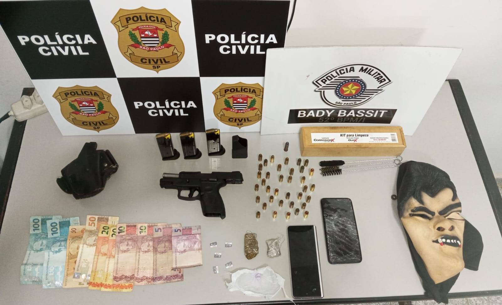 O autor foi preso em flagrante por posse ilegal de arma de fogo e tráfico de drogas. Após ser ouvido, ele permanecerá à disposição da justiça.
