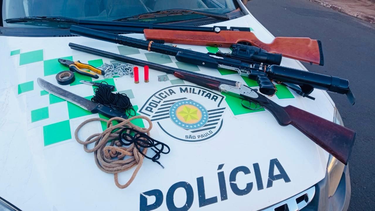 A Polícia Militar Ambiental prendeu um homem em Cardoso por posse irregular de armas de fogo e caça ilegal. A ação aconteceu durante um patrulhamento rural, quando os policiais notaram uma motocicleta sem placa e o condutor, ao avistar a viatura, tentou fugir a pé.