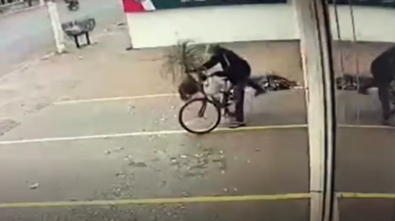 Horas depois, um segundo homem passa pelo local de bicicleta. Ele para, pega o coqueiro deixado no chão e o leva embora de bicicleta.