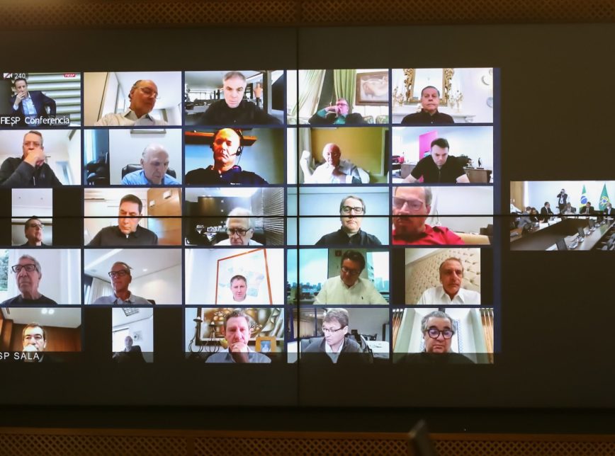 A certa altura, Bolsonaro interrompeu uma fala do presidente da Fiesp (Federação das Indústrias do Estado de São Paulo), Paulo Skaf, para avisar que uma das pessoas assistindo a transmissão aparecia pelada em sua webcam.