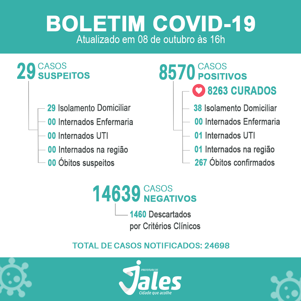 Mais 1 pessoa foi recuperada da covid-19 e liberada do isolamento domiciliar. Com ela, Jales contabiliza 8263 pacientes curados.