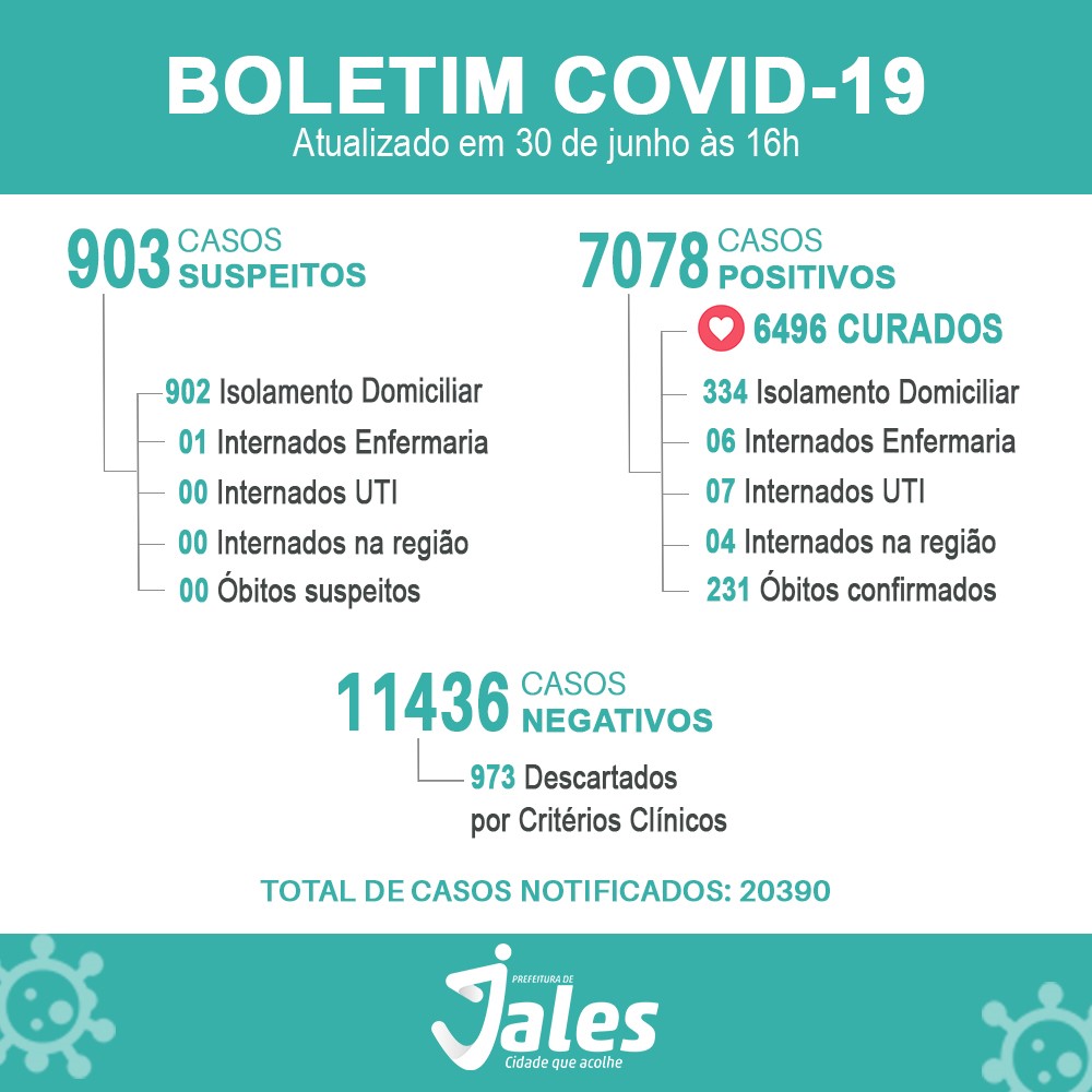 A Prefeitura de Jales informa que mais duas pessoas foram recuperadas da covid-19 e liberadas do isolamento domiciliar. Com elas, Jales contabiliza 6.496 pacientes curados.