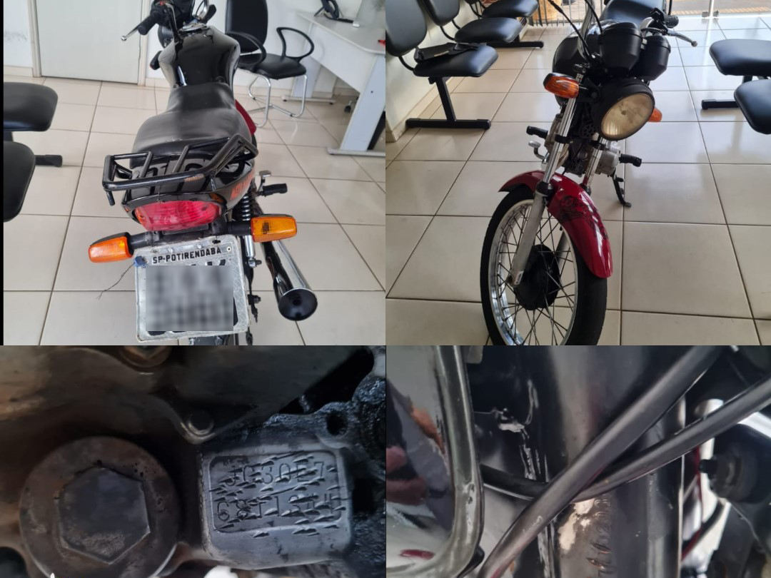 Durante pesquisa, os policiais constataram que ele não possuía CNH e a motocicleta apresentava uma placa referente a uma motocicleta cadastrada no município de Sorocaba (SP), porém sua tarjeta constava Potirendaba. A numeração do chassi e do motor também estavam adulteradas.