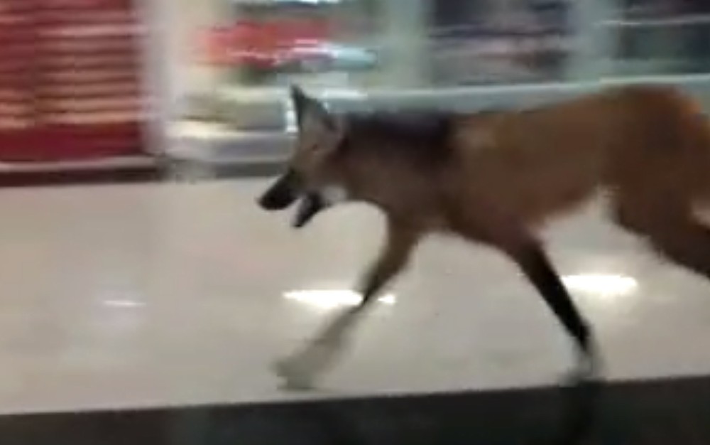 Um lobo-guará foi filmado “passeando” em um shopping de Jataí, no sudoeste de Goiás. Alguns funcionários presenciaram o momento em que o animal passa correndo por um dos corredores do centro de compras durante a madrugada.