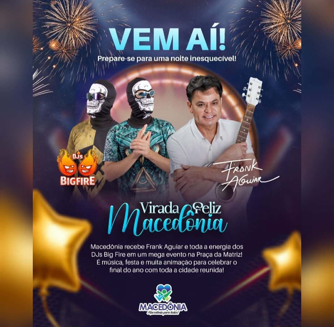 A cidade de Macedônia se prepara para viver mais uma noite especial dentro da programação da Virada Feliz Macedônia. No dia 27 de dezembro, a partir das 22h, a Praça da Matriz será palco de um grande espetáculo musical com o cantor Frank Aguiar e a energia contagiante dos DJs Big Fire.