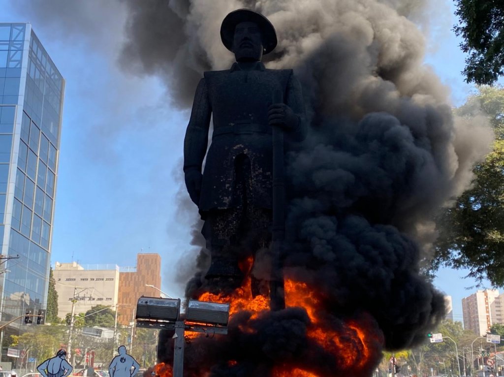 Cerca de 20 pessoas atearam fogo em pneus na base da estátua do Borba Gato, na zona sul de São Paulo, no inicio da tarde deste sábado (24). De acordo com a Polícia Militar (PM), o monumento foi danificado. Tratou-se de uma manifestação e ninguém foi detido. Uma equipe do Corpo de Bombeiros foi enviada ao local às 14h06 e o fogo foi extinto rapidamente. Não houve registros de feridos ou qualquer outro incidente.