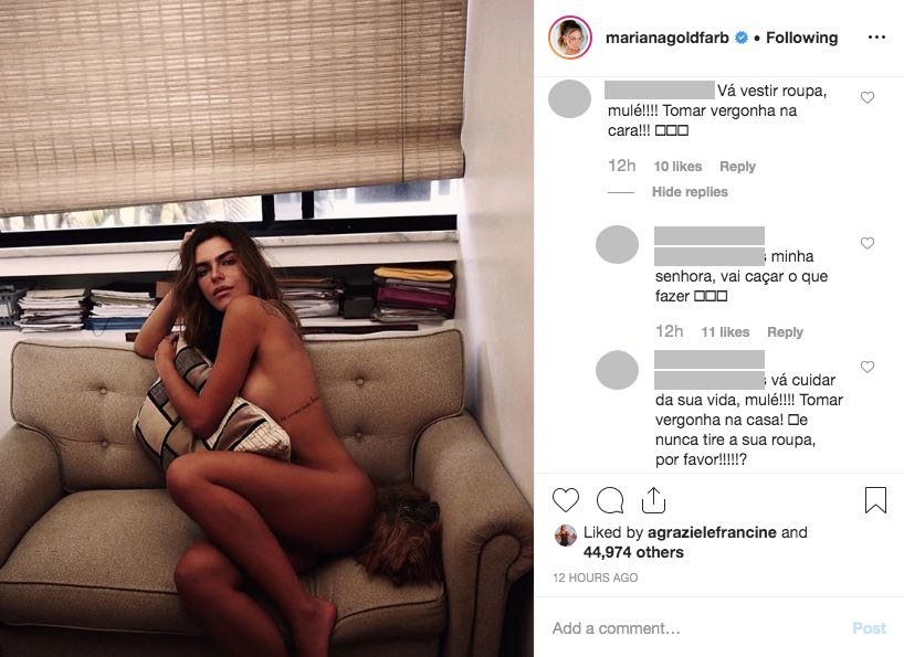 “Vá vestir roupa, mulé!!!! Tomar vergonha na cara!!!”, disparou. A mensagem gerou reações de outros seguidores de Mariana. “Minha senhora, vai caçar o que fazer”, sugeriu uma. “Vai cuidar da sua vida, mulé!!! Tomar vergonha na casa! E nunca tire sua roupa, por favor!!!”, provocou outra.