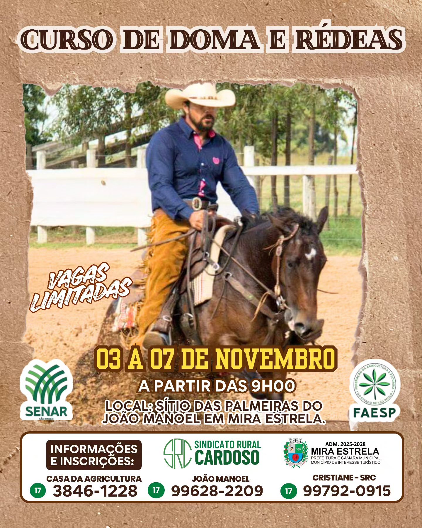 Os amantes do cavalo e profissionais do campo terão uma oportunidade de aprimorar seus conhecimentos em técnicas de doma e rédeas. A cidade de Mira Estrela sediará um curso gratuito sobre o tema, com vagas limitadas.