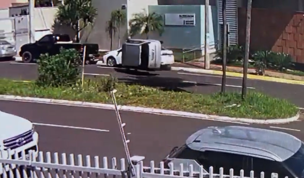 Uma imagem feita por uma câmera de monitoramento mostra o momento em que o carro atinge um Toyota Corolla que estava estacionado e, em seguida, capota na avenida. Na sequência, o motorista sai do veículo, ainda atordoado com a pancada.