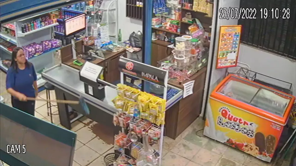 Uma mulher reagiu a um assalto e expulsou o ladrão a vassouradas, em uma loja na Fercal, no Distrito Federal, na noite de quarta-feira (27). A ação foi gravada pelas câmeras de segurança do estabelecimento.