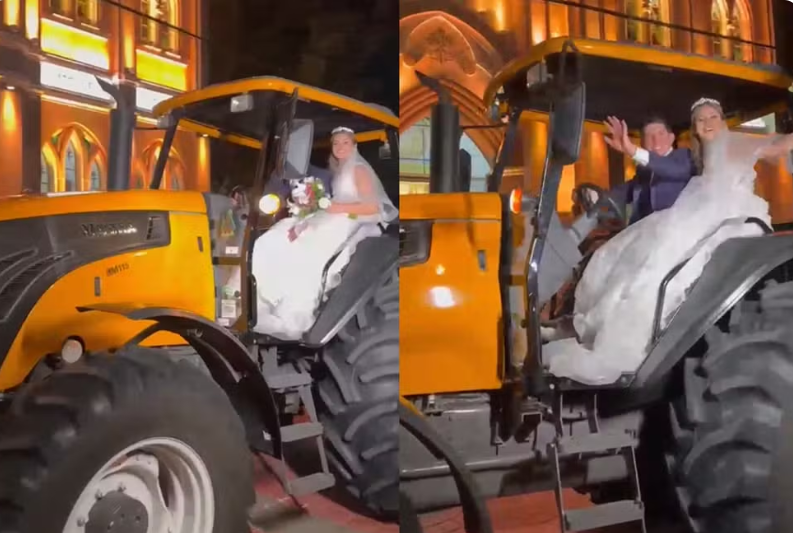 Depois da cerimônia, os dois também deixaram o local no trator, que pertence ao pai e ao tio da noiva.