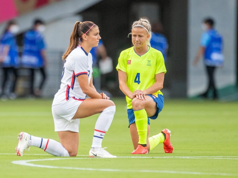 A partida realizada em Sapporo nesta quarta-feira ficou marcada pela imagem dos dois times se ajoelhando antes do apito inicial. O ato antirracista e contra o ódio online foi visto na TV e seguido pelas seleções dos Estados Unidos, da Suécia e da Nova Zelândia. Apesar disso, o gesto não esteve presente em nenhum dos perfis oficiais de Tóquio-2020 e nem do COI. As páginas de Facebook e Twitter dos Jogos, assim como a do Instagram, com mais de 500 mil seguidores, não cobriram o momento.