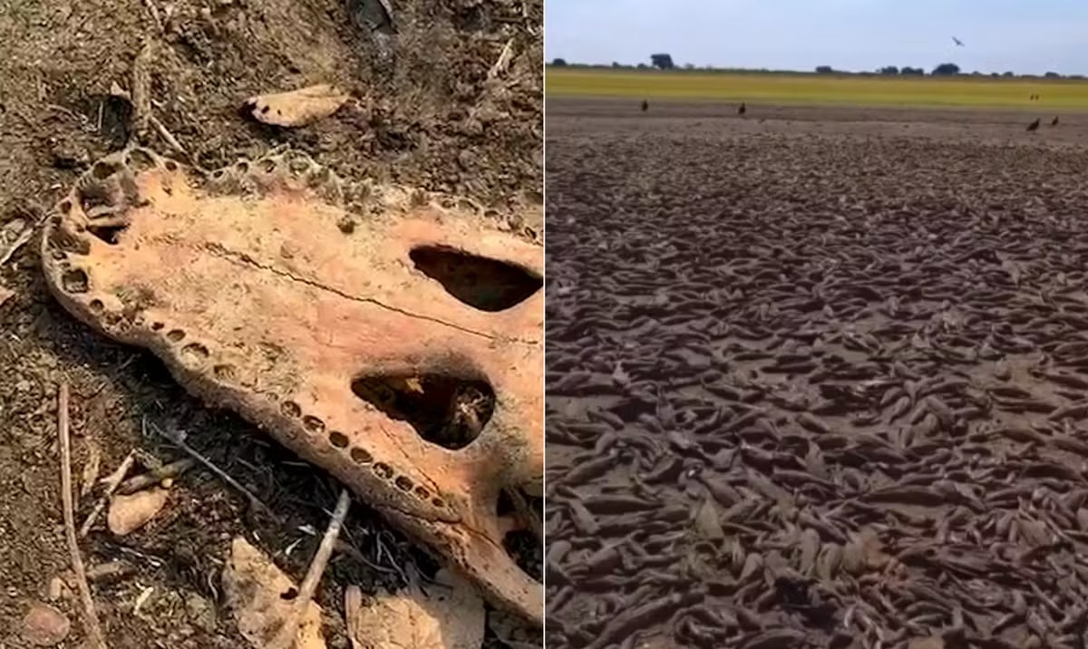Imagens registradas por pescadores em Corumbá, Mato Grosso do Sul, mostram a devastação causada pela seca e queimadas, com centenas de peixes e jacarés mortos. No material, capturado perto da Baía do Castelo, animais são vistos tentando sobreviver em áreas onde a água secou – a região, conhecida como a “capital do Pantanal”, enfrenta uma das piores crises ambientais de sua história.
