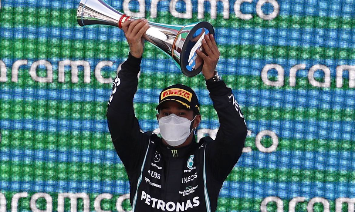 A 98ª vitória do britânico, de sua 100ª pole, foi sua terceira em quatro corridas e ele e a Mercedes realizaram uma grande estratégia depois que Verstappen, da Red Bull, que terminou em segundo, assumiu a liderança na primeira curva.