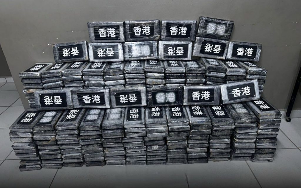A Polícia Militar apreendeu, nesta sexta-feira (25), quase 350 quilos de cocaína que tinham como provável destino o sudeste asiático, onde o quilo pode chegar a US$ 80 mil. Os tijolos do entorpecente foram embalados com a inscrição de Hong Kong, região administrativa da China.