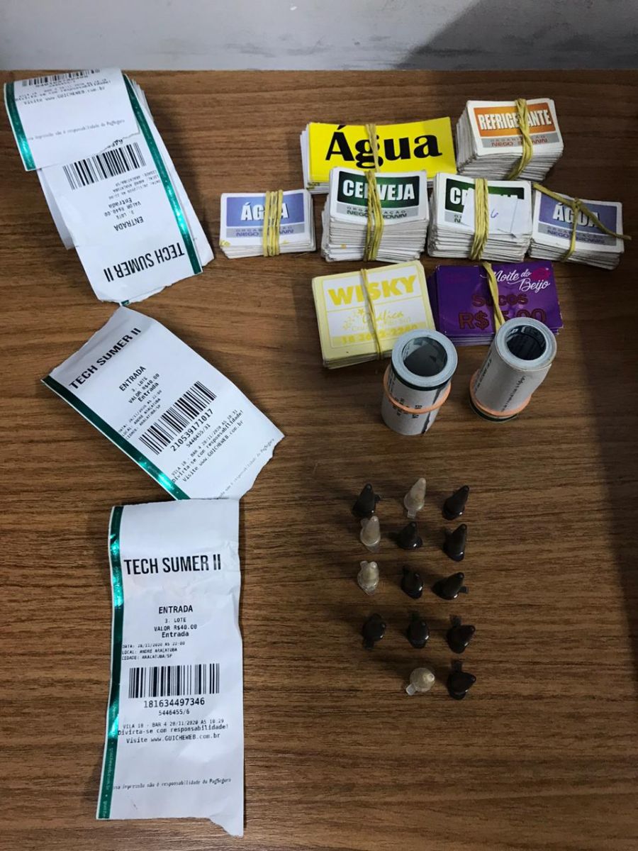 Durante uma vistoria no local, foram localizados 14 pinos de cocaína, fichas de consumo de bebidas e convites para a festa. Os ingressos marcavam que o preço cobrado para entrar na festa foi R$ 40.