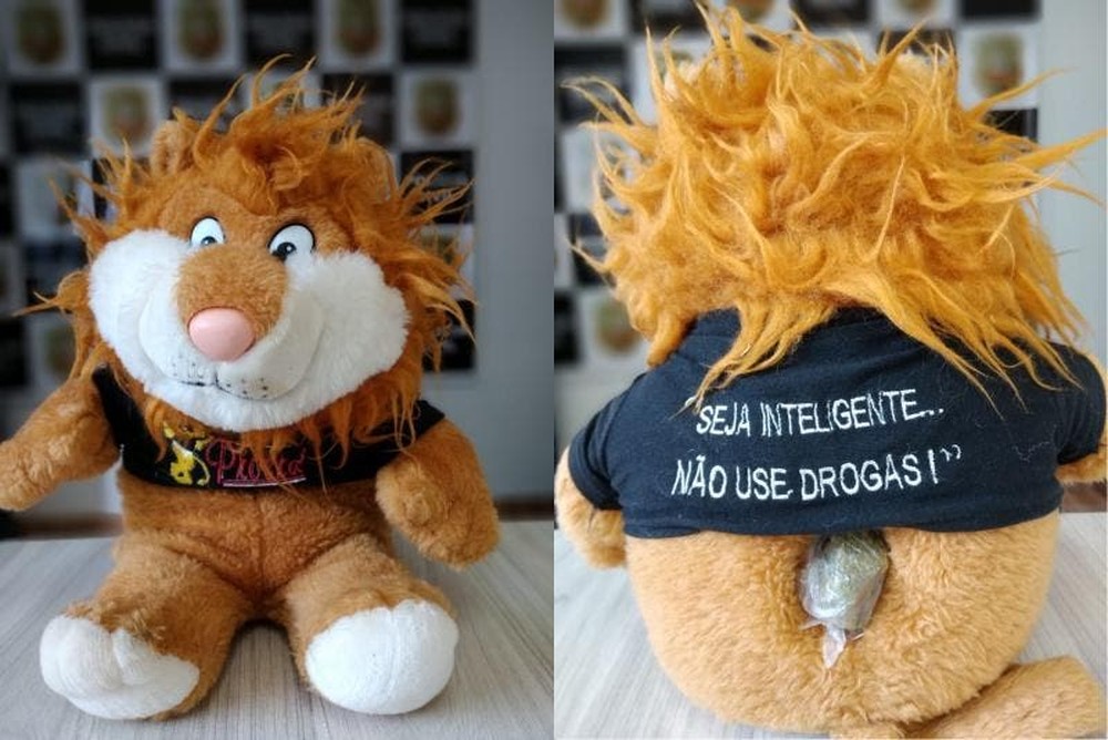 Uma porção de maconha foi encontrada escondida dentro de um leão de pelúcia símbolo do Programa Educacional de Resistência às Drogas e à Violência (Proerd) da Polícia Militar.