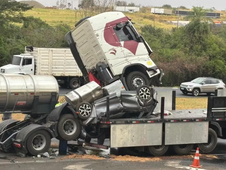 O acidente ocorreu na quarta-feira (20) na Rodovia Washington Luís (SP-310). Um vídeo das câmeras da carreta mostra o motorista com os olhos fechados e os braços cruzados enquanto o trânsito está parado. Poucos segundos depois, o veículo avança sobre o carro da vítima, que fica completamente esmagado. O motorista só reage após o impacto.