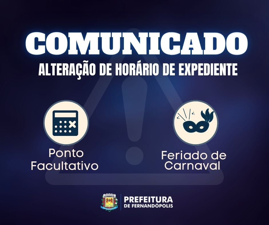 A Prefeitura de Fernandópolis, por meio da Lei 4.029 de 07 de dezembro de 2012, decreta como ponto facultativo a segunda-feira, dia 28 de fevereiro de 2022.