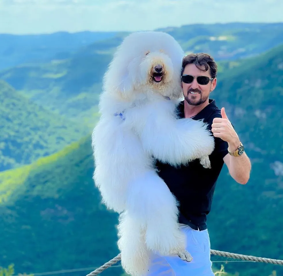 Brady divide a conta no Instagram com Guci e, juntos, conseguem chamar a atenção para causas importantes, segundo Giseli. O sucesso nas redes veio depois de um vídeo que mostra a reação do poodle gigante ao levar uma bronca de seus tutores.