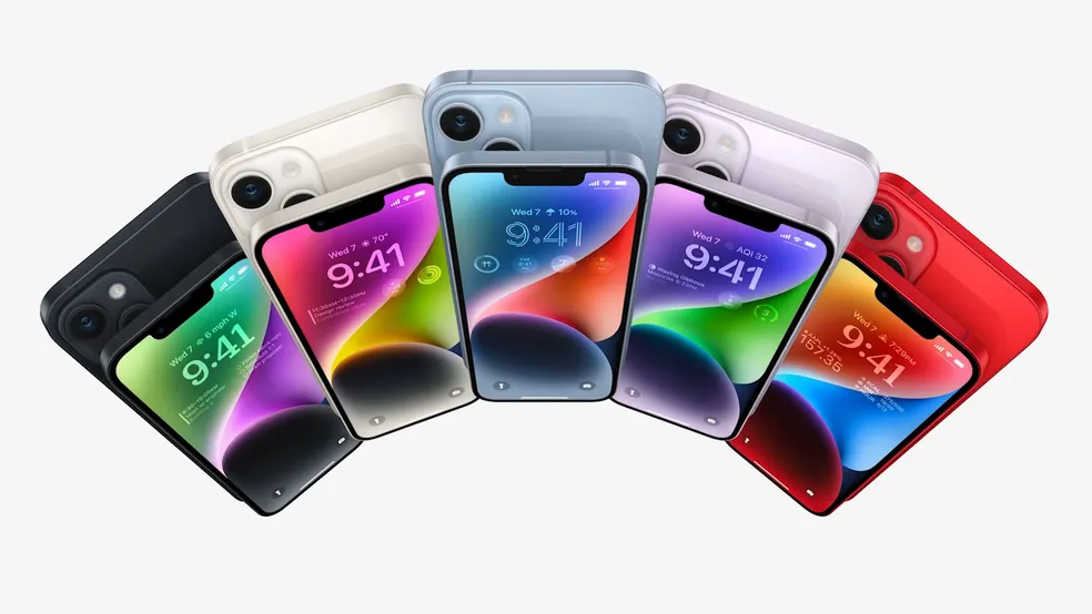 O iPhone 14 e o iPhone 14 Plus têm telas de 6,1 polegadas e 6,7 polegadas, respectivamente. A versão mini, que existia desde o iPhone 12, não recebeu uma atualização.