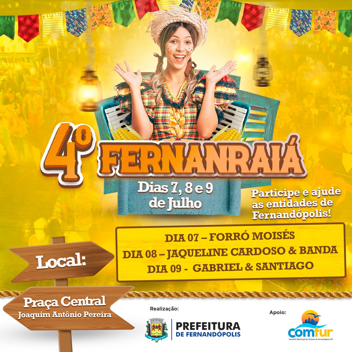 Contagem regressiva para a 4ª edição do FernanRaiá. Os preparativos para a tradicional festa julina realizada pela Prefeitura de Fernandópolis já estão em fase final. Em mais um ano a praça central ganhará muitas cores, animação e solidariedade. Serão três noites de atrações, dias 07, 08 e 09 de julho.