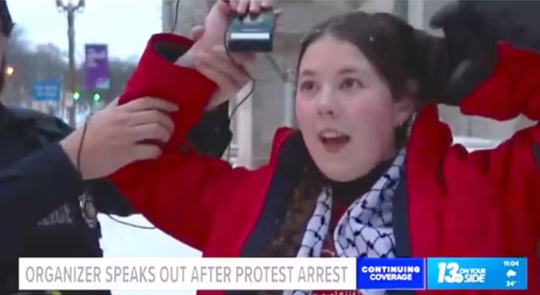 Nas imagens da transmissão, dois policiais se aproximam por trás dela enquanto ela finalizava a entrevista com a WZZM, afiliada da ABC na cidade, e a escoltam para fora do enquadramento enquanto ela diz: “Não estou resistindo à prisão”. Ela foi a única detida.
