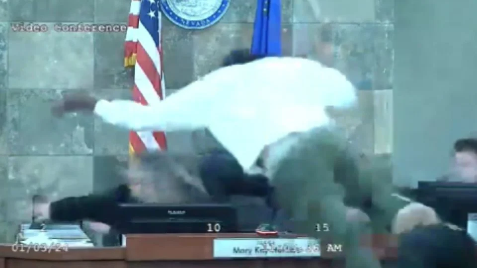 Uma juíza em Las Vegas, nos Estados Unidos, foi atacada durante uma audiência nesta quarta-feira (3) enquanto proferia a sentença de Delone Redden, condenado por agressão agravada com lesões corporais. Nas imagens registradas por câmeras de segurança, o agressor aparece “voando” em direção à magistrada.