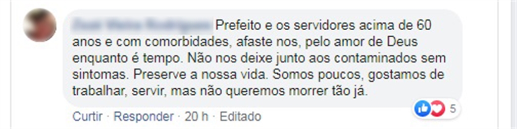 Em uma publicação na página do Facebook da própria Prefeitura, uma servidora do Executivo relatou: “prefeito, e os servidores acima de 60 anos e com comorbidades? Afaste-nos, pelo amor de Deus, enquanto é tempo. Não nos deixe junto aos contaminados sem sintomas. Preserve a nossa vida. Somos poucos, gostamos de trabalhar, servir, mas não queremos morrer tão já”. Procurada pelo jornal A Cidade, a servidora não quis comentar o assunto. A servidora apagou a postagem das redes sociais.