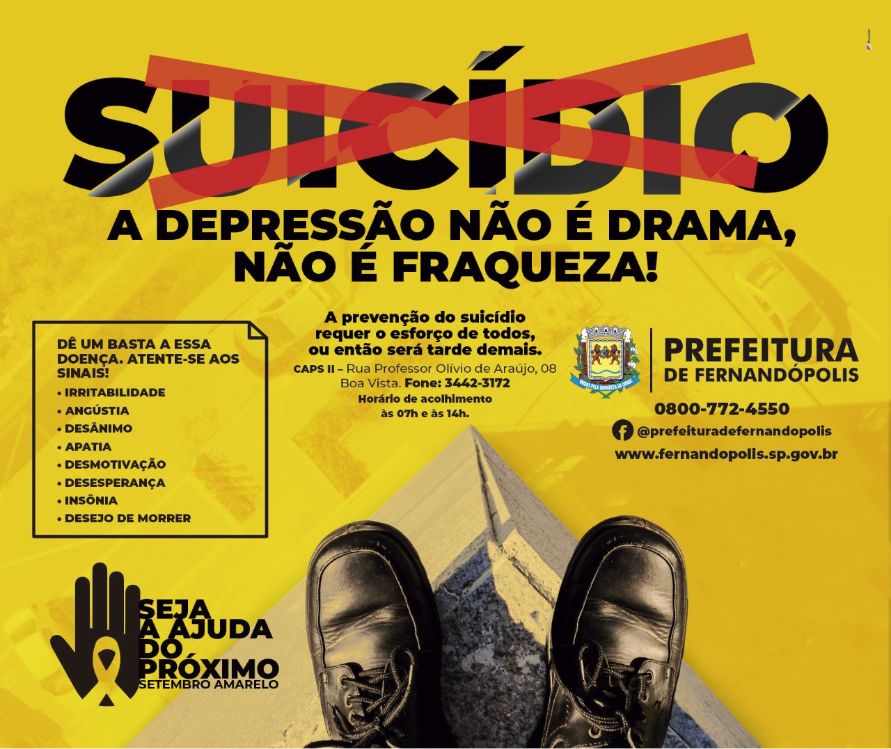 Em Fernandópolis, o CAPS II (Centro de Atenção Psicossocial) e o Núcleo Ampliado de Saúde da Família e Atenção Básica NASF, ligados a Secretaria Municipal de Saúde, realizam durante todo o mês a campanha ‘Setembro Amarelo’, em alusão ao mês de prevenção ao suicídio.