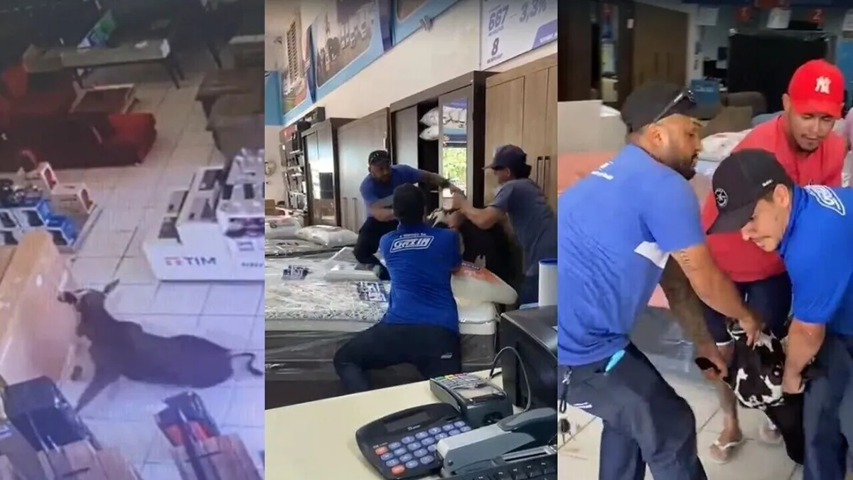 Uma vaca entrou desgovernada em uma loja de móveis, em Anaurilândia (MS) – cidade a 380 km de Campo Grande -, assustou os vendedores e deu um verdadeiro “baile” para ser resgatada do estabelecimento nessa quarta-feira (26).