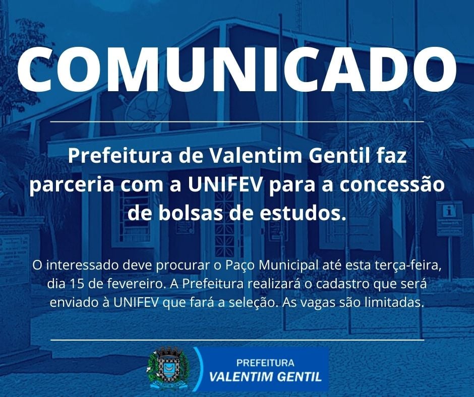 A Prefeitura de Valentim Gentil continua com a parceria com a UNIFEV – Centro Universitário de Votuporanga para a concessão de bolsas de estudos em vários cursos no ensino superior aos estudantes do Município.