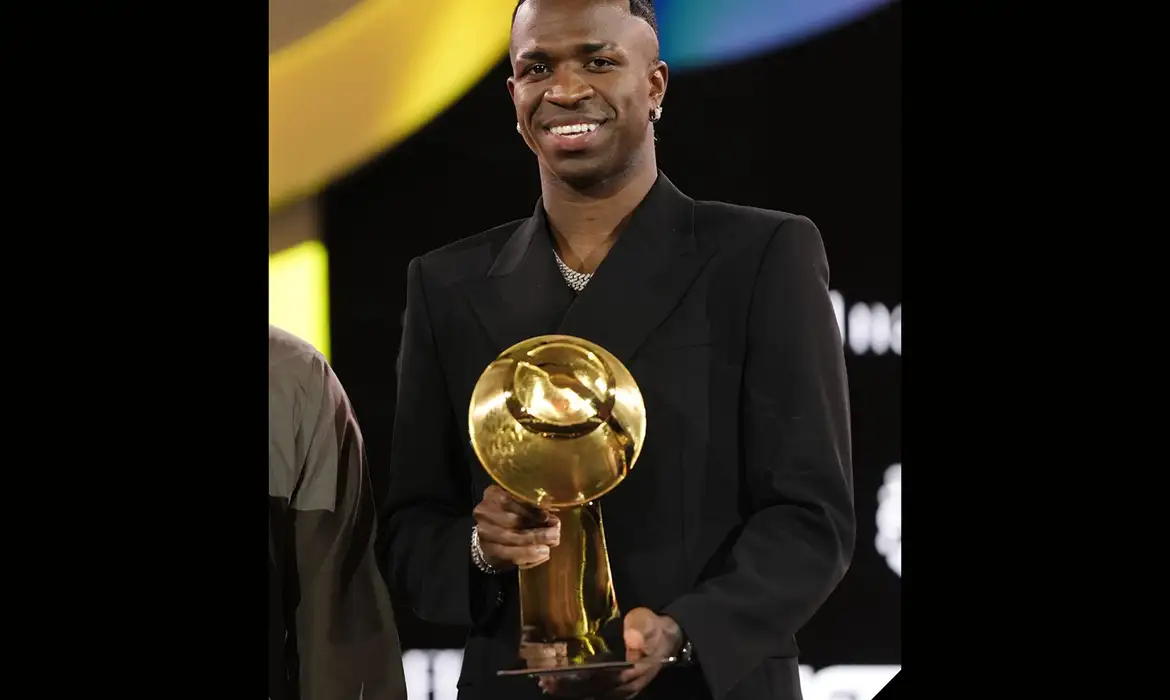 Vini Jr foi agraciado com um segundo prêmio da Globe Soccer: o de melhor atacante do ano. O próprio atleta recebeu pessoalmente a premiação hoje (27), durante cerimônia de gala em Dubai (Emirados Árabes Unidos). Outro brasileiro homenageado foi Neymar, agraciado com o prêmio de carreira da Globe Soccer Awards.