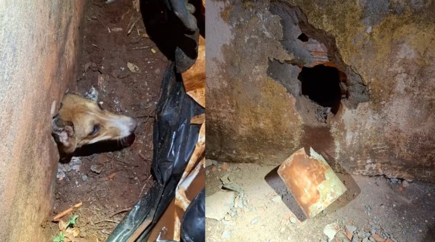 Um vira-lata “caramelo” foi resgatado pelo Corpo de Bombeiros após ficar com a cabeça presa em um cano de drenagem instalado no muro de uma casa. O caso foi registrado na noite de sábado (11), em Ituiutaba, no Triângulo Mineiro.